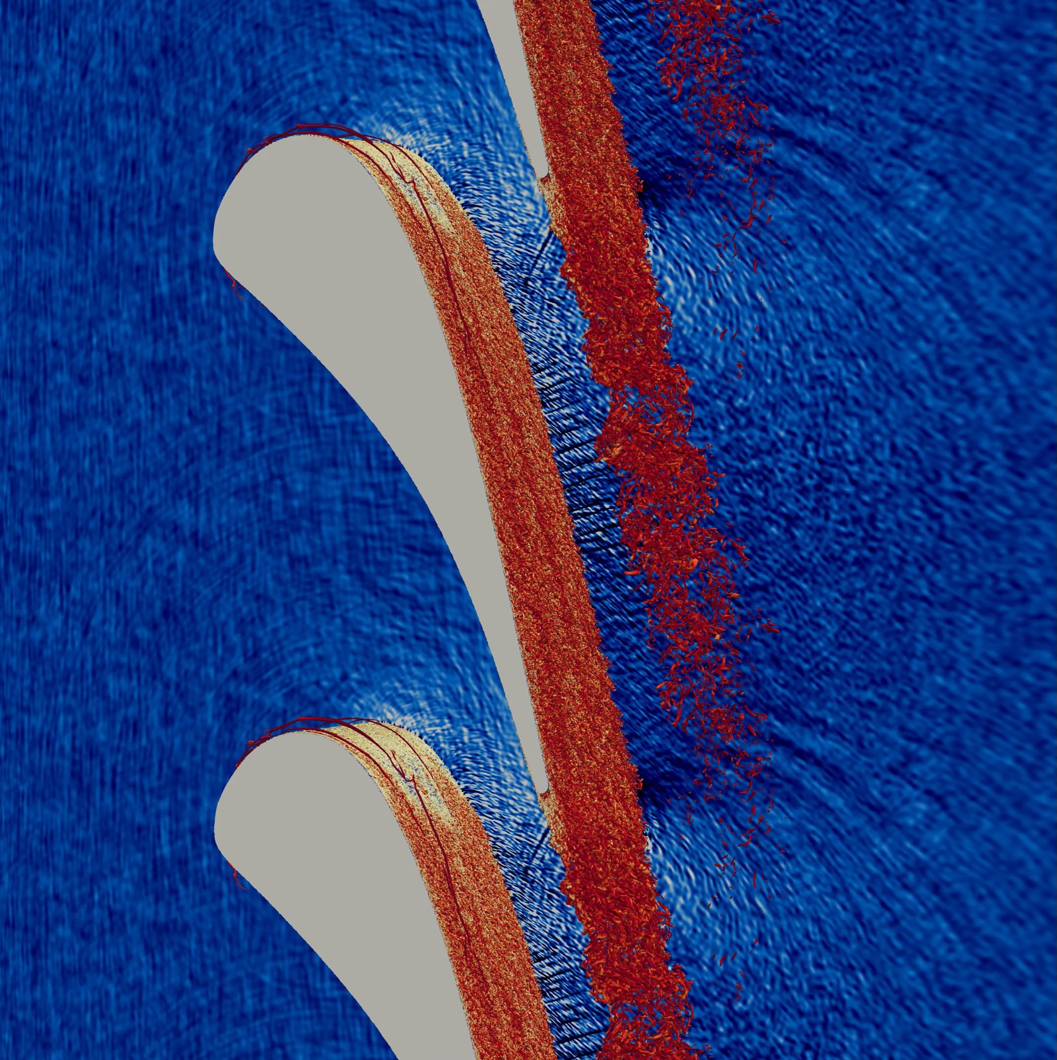 Flow past HPT vane with micron-scale surface roughness at Reynolds number = 590,000 and Mach number = 0.92. Data include instantaneous density gradient (blue) and instantaneous vortical structures (red iso-volumes). Credit: Thomas Jelly, University of Melbourne in Australia
