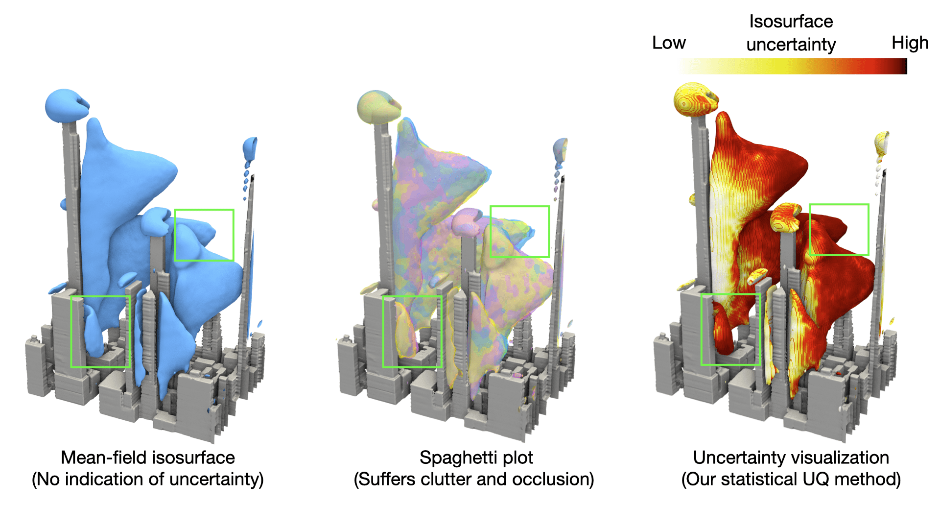 We visualize the results for the 3D turbulent flow ensemble simulation. This data comes from a Large Eddy Simulation (LES) of flow through part of Manhattan, NYC, just south of Central Park. To investigate uncertainty with regard to the subgrid-scale (SGS) turbulence parameterization, three different parameters (total dissipation, shear production, and dissipation rate) are run at default values, as well as, half their default values, tensored into a total of 2 × 2 × 2 = 8 simulations. The simulations are performed on the Frontier supercomputer at the Oak Ridge National Laboratory. The image shows isosurface visualizations of a vertical component of wind among the eight simulations. The isosurface extracted from the mean of the ensemble data (the leftmost image) does not portray spatial uncertainty of the isosurface. Visualizing uncertainty, however, is critical for avoiding data misrepresentation and mitigating errors in analysis. The spaghetti plot of isosurfaces of the simulation runs (the center image) portrays spatial uncertainty, but it significantly suffers from occlusion and clutter issues in 3D and leads to new undesired surface colors due to color blending. Our statistical uncertainty quantification (UQ) of isosurface vertices enables us to clearly communicate positions of relatively high uncertainty through colormapping (the rightmost image), thereby providing more robust visual representation of the data. The Viskores library and ParaView are used to create visualizations.